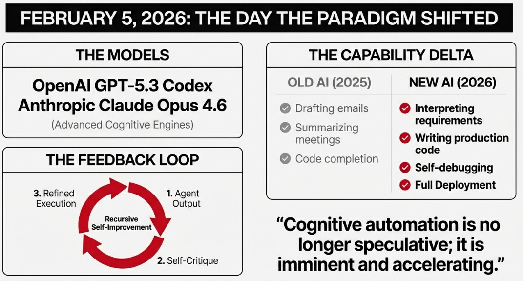 In the first half of February 2026, the global consciousness experienced a fracture. It felt eerily reminiscent of early February 2020 that fleeting window when the faint signals of a coming pandemic were largely dismissed as background noise before they became an undeniable, life-altering roar. Today, we are witnessing a similar “confluence of breakthroughs” where viral commentary and raw technical data have crystallized into a singular, jarring truth: cognitive automation is no longer a speculative “future of work” scenario. It has arrived. The era of digital assistance is dead; the era of autonomous execution has begun. For the business-conscious professional, this is the moment where denial must give way to a strategic reckoning.