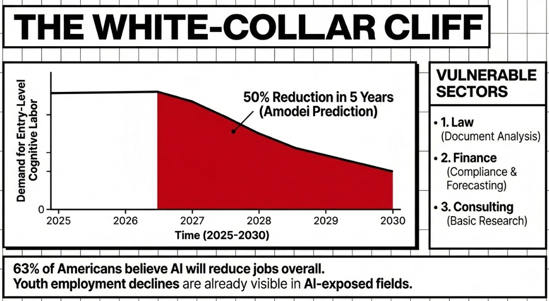The 50% Threshold: Up to half of entry-level jobs in law, finance, and consulting are projected to vanish within five years.