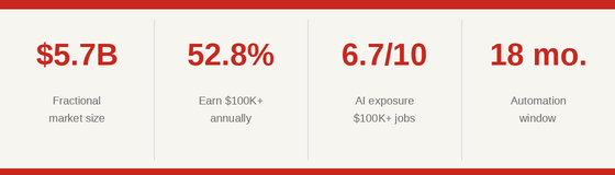 Here is what most professionals miss: the risk and the opportunity are the same thing. The same forces compressing salaried professional roles are creating enormous demand for experienced judgment delivered independently. The fractional market grew 68% last year. It is currently a $5.7 billion market. More than half of fractional professionals earn over $100,000 annually.
