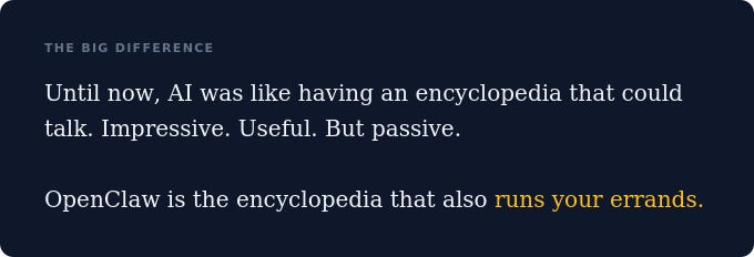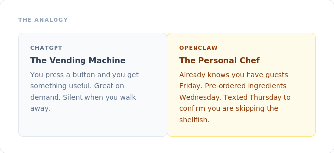 Think of the difference between a vending machine and a personal chef. ChatGPT is an exceptional vending machine. You press a button and you get something useful. OpenClaw is the chef who already knows you are having guests on Friday, who pre-ordered the ingredients on Wednesday, and who texted you Thursday night to confirm you are not doing the thing with shellfish again.