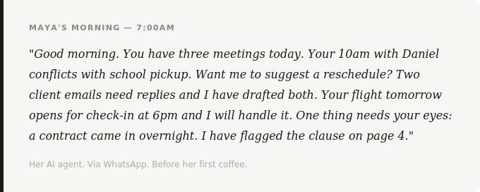 At 7am, her phone buzzes once. It is a WhatsApp message, not from a person, but from her AI agent. It reads: