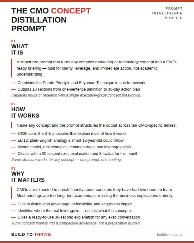 One helps you turn any marketing or technology concept into a clear executive briefing, so founders, operators, or marketers can explain it fast and act on it without wading through research.