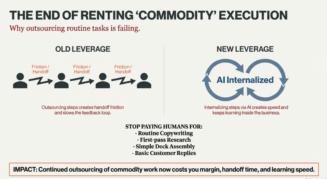 Renting labor is structurally inferior to owning execution when the work is repeatable. If you keep outsourcing commodity steps, you lose margin and you lose learning signals that train your system and your judgment. Meanwhile, AI tends to intensify work unless you intentionally design limits, which punishes operators who “add AI” without redesigning how they operate.