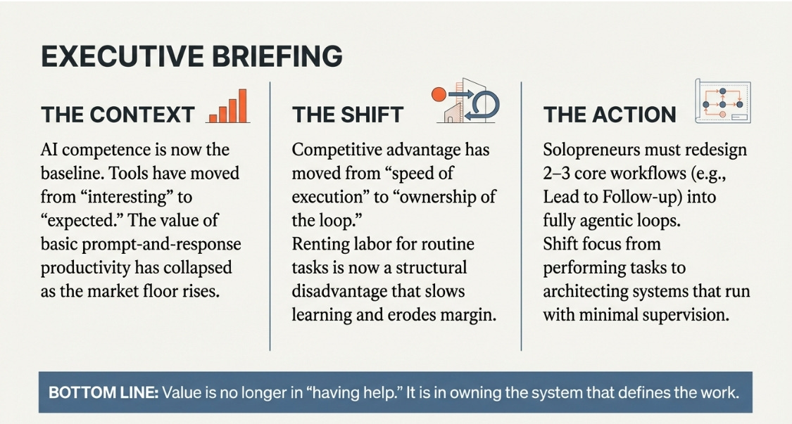AI competence is now assumed at solo scale. Nobody cares that you used a tool. They care that you respond faster, personalize better, and ship reliably. The baseline rose. Advantage moved from “having help” to owning the loop: inputs to decisions to outputs to feedback, so every week you get harder to compete with.