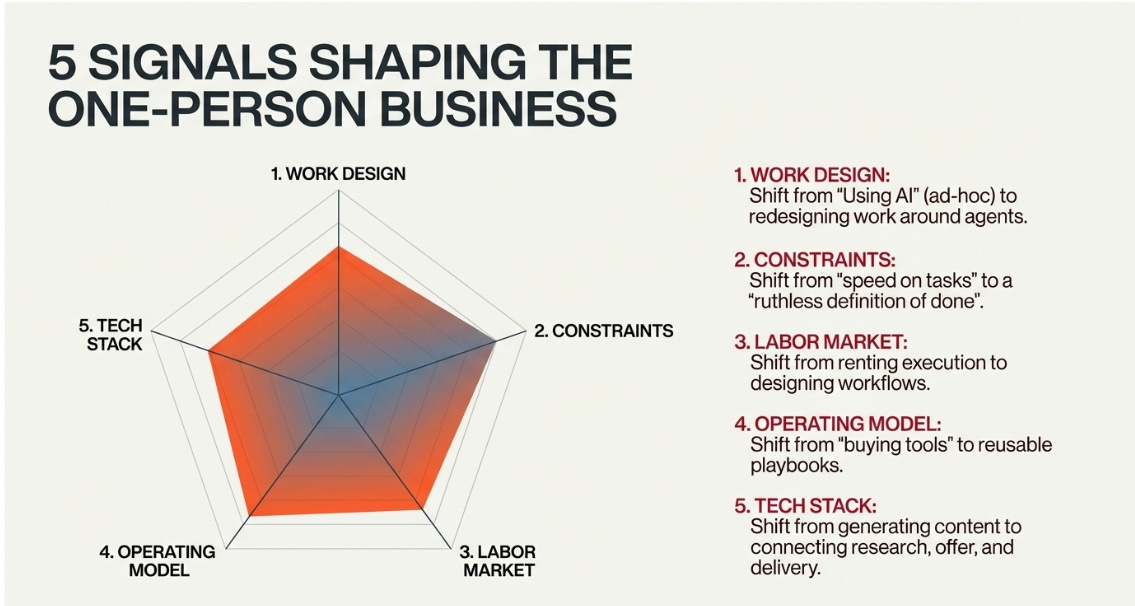 Shift: The one-person business stack is more complete, and more punishing if you treat it like a toy. What got commoditized is “I can generate content.” What is scarce now is connecting research to offer to follow-up to delivery into one loop that runs daily. Solo impact: faster response to demand signals and fewer dropped leads.