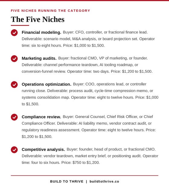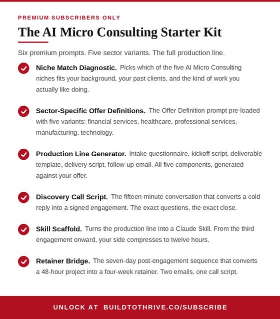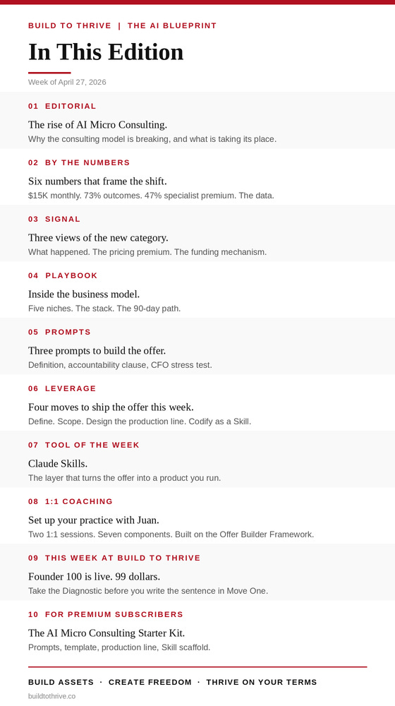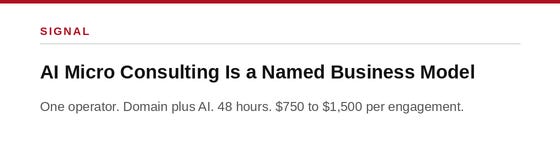 What it means for professionals and business owners: The category now has a name, a pricing floor, and a delivery structure at the same time. That almost never happens in a new service market, and when it does, the window to establish yourself inside it closes faster than most people notice. The 48-hour engagement is not a smaller version of a consulting project. It is a product. Which means the unit economics change completely. You are not pricing eight hours of prompting. You are pricing the fact that the deliverable is judged, not drafted. You are not scoping a discovery phase, a development phase, and a handoff. You are scoping a single bounded outcome with a regulatory or commercial deadline, and your production method is what compresses the work from two weeks to two days. This is the first offer format since the subscription software bundle where the operator’s margin comes from how good the template is, not how many hours they can put on the invoice. Most of my audience has the expertise for three to five of these offers already sitting in their past work. What they do not have is the one-page product definition, the pricing clause, and the outcome language that turns expertise into something a client can say yes to in one email.