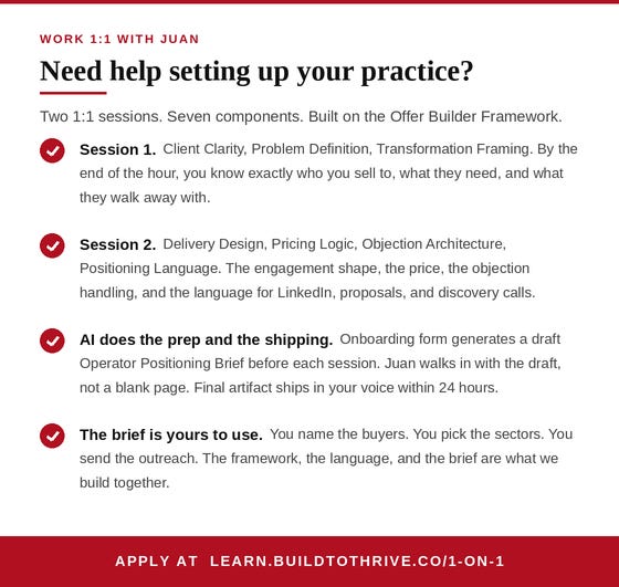 Every one of those signals points to the same offer shape. Small. Bounded. Outcome-accountable. Priced as judgment. Repeatable.