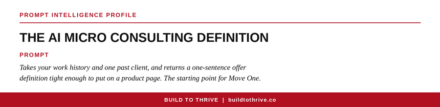 The 48-Hour Offer Definition Prompt Takes your work history and one past client you know well, and returns a one-sentence offer definition that names the specific deliverable, the specific buyer, the specific outcome, and the specific judgment they are paying for. Rewrites the sentence five ways until it is tight enough to put on a product page. The starting point for every offer component below.