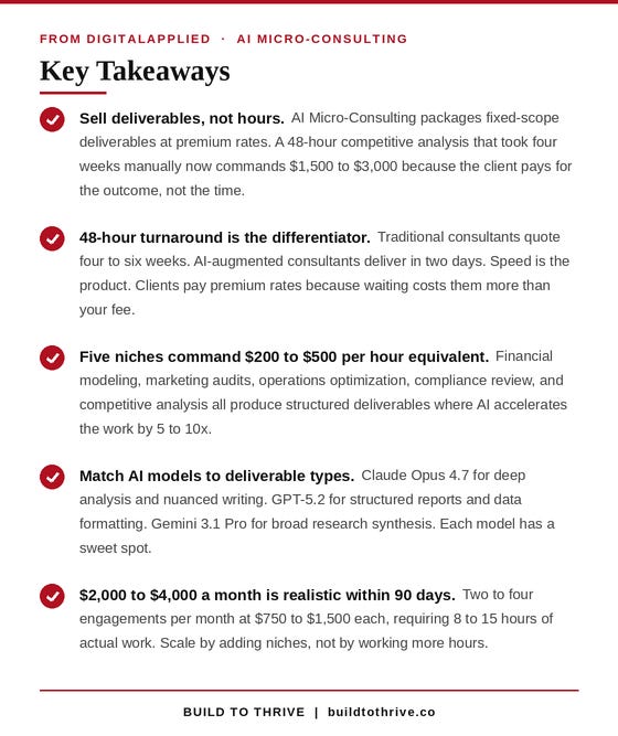 AI micro-consulting are short, high-value engagements where one operator pairs domain expertise with AI tools to deliver in 48 hours what previously required a team working two weeks. A competitive analysis that took three analysts two weeks can now be completed in four to six hours by one person using current AI tools. Income benchmarks named for the first time in a single piece: 750 to 1,500 dollars per engagement, two to four engagements per month realistic within ninety days, 8,000 to 15,000 per month within eighteen to twenty-four months working fifteen to twenty hours per week. The model scales through better templates, higher prices, and repeat clients. Not more hours.