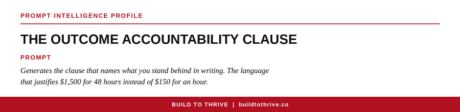 The Outcome Accountability Clause Generates the clause you put at the bottom of your one-page offer that names what you stand behind in writing. Turns “we will deliver a report” into “you will leave this engagement able to make the following three decisions you cannot make today.” The language that justifies 1,500 dollars for 48 hours instead of 150 dollars for an hour.