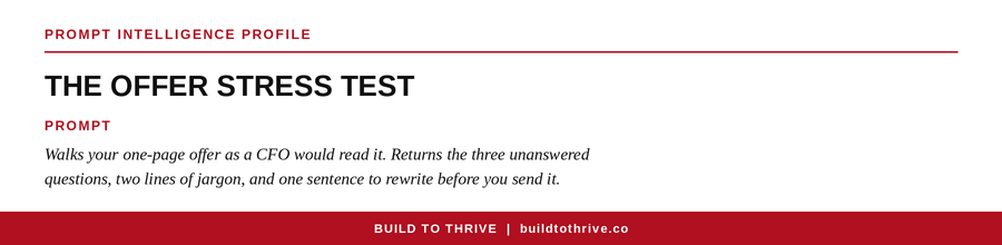 The Offer Stress Test Walks through your one-page offer as a CFO would read it. Returns the three questions the buyer will have that are not yet answered, the two lines that read like consulting jargon, and the one sentence that must be rewritten before you send it. A final pass before the offer leaves your desk.