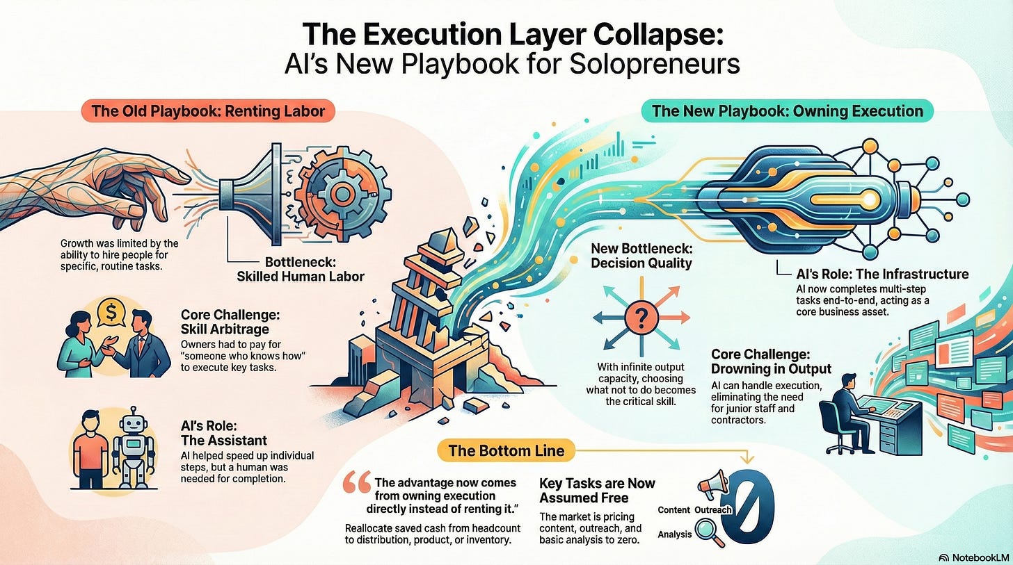 This week marked a quiet but decisive shift: AI is no longer just accelerating work, it is collapsing entire paid execution layers that solopreneurs historically outsourced. The baseline for what one person can ship alone just jumped again. With huge societal implications, anyone still buying human labor for routine execution is now structurally overpaying.