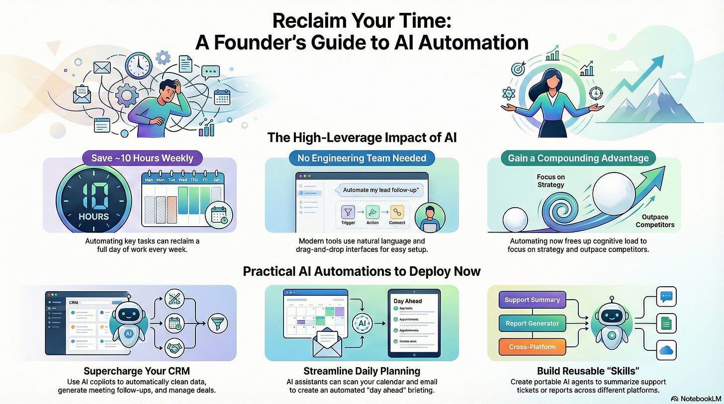 A weekly snapshot of practical AI automations founders can deploy immediately to increase output without adding headcount