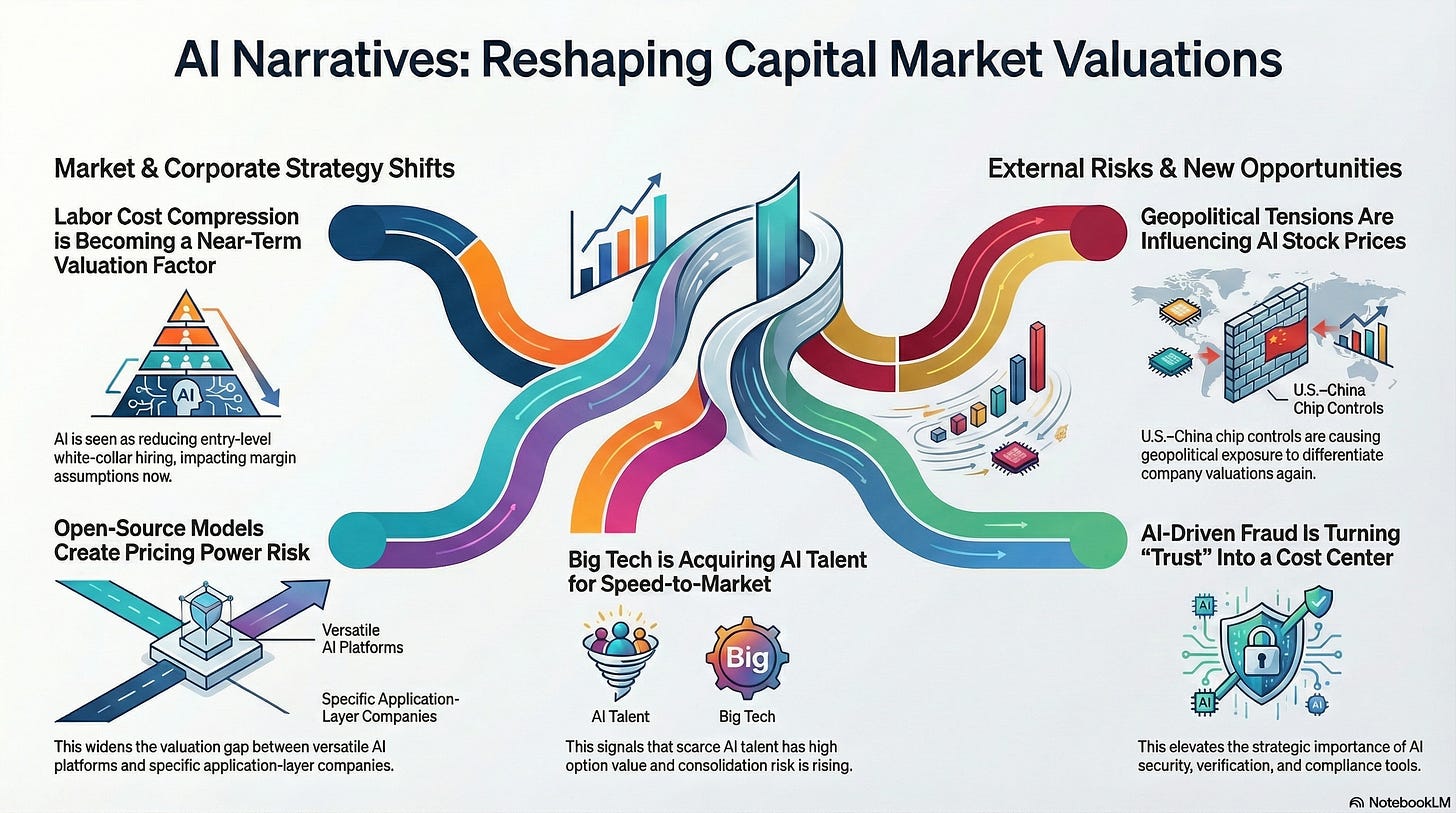 A concise snapshot of the AI narratives currently shaping how markets, media, and institutional investors are reframing risk, margins, and valuation