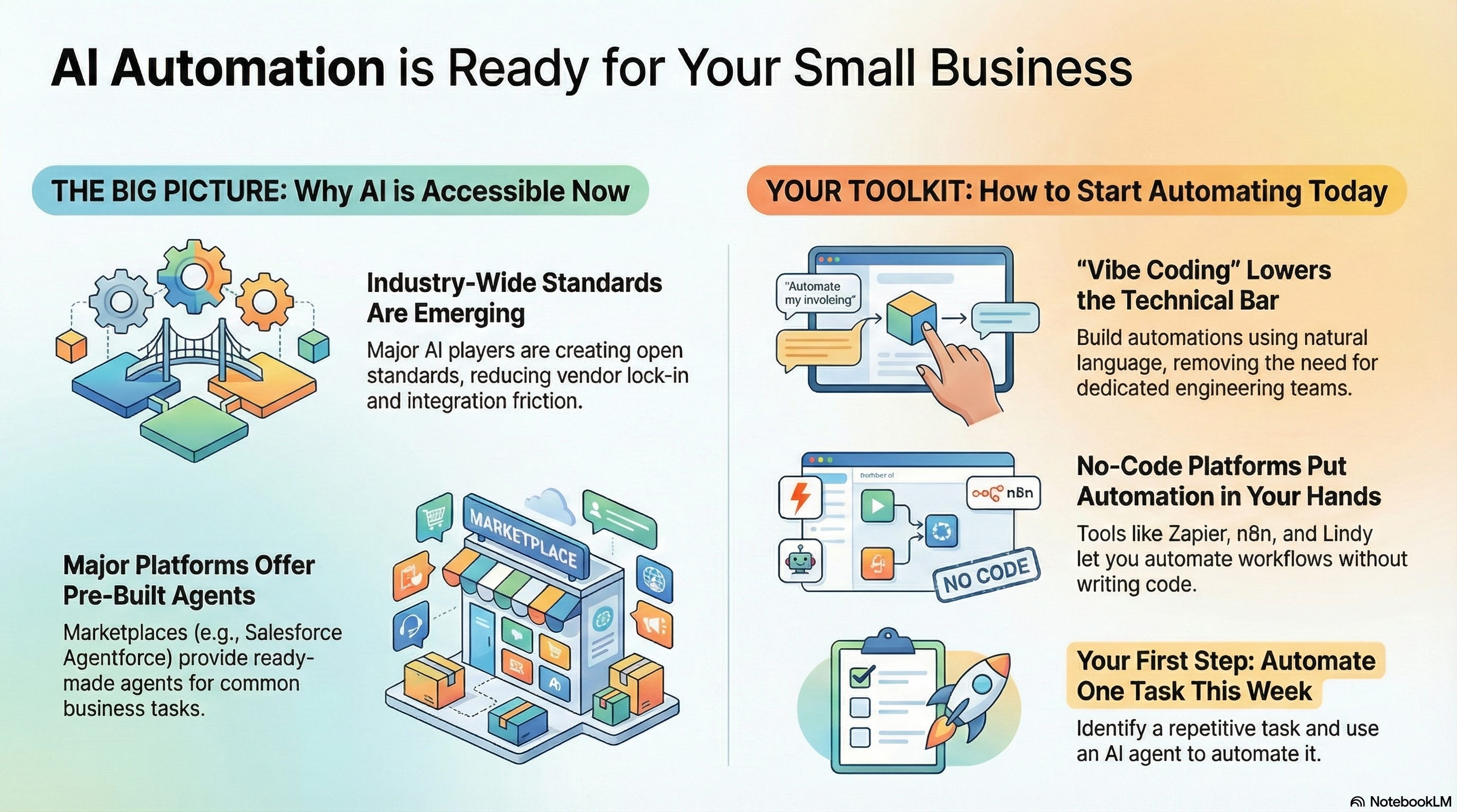 This week’s developments show that AI automation isn’t just advancing, it’s coalescing around usable standards and platforms that small teams can adopt today. When the industry aligns on open agent frameworks and major players expand agent marketplaces, accessibility improves and vendor lock-in drops. That matters because small teams win when they build repeatable, scalable workflows that replace manual labor. Automating just one repetitive task now compounds over time into hours freed, higher throughput, and faster strategic iteration.