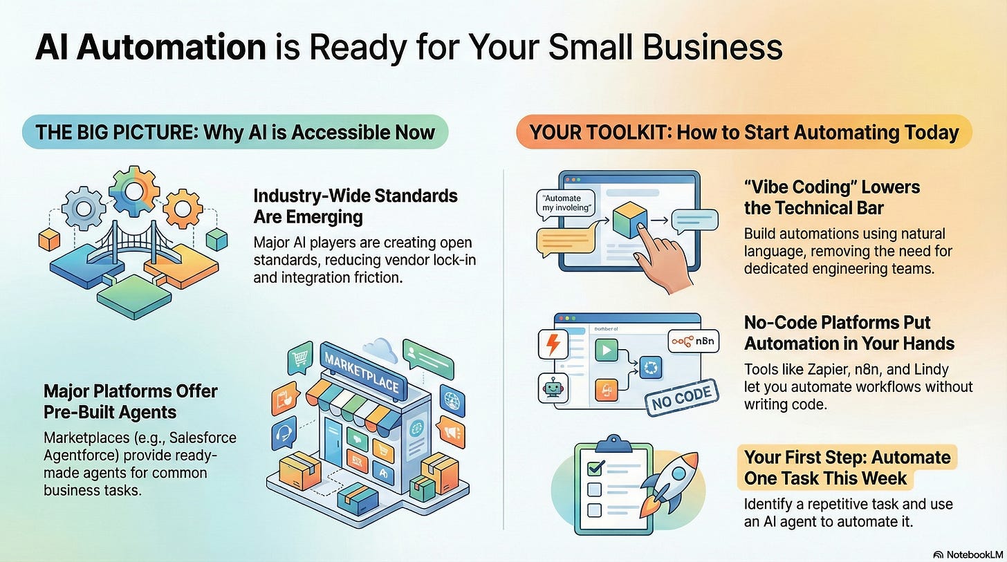 This week confirms that AI agents and automation are maturing into genuinely accessible tools for small teams, not just enterprise R&D headlines. Founders now have both practical automations worth deploying this week and macro signals showing where the industry is standardizing and accelerating. The key is to focus on agent-enabled workflows that replace repetitive work and unlock hours of leverage without technical debt.