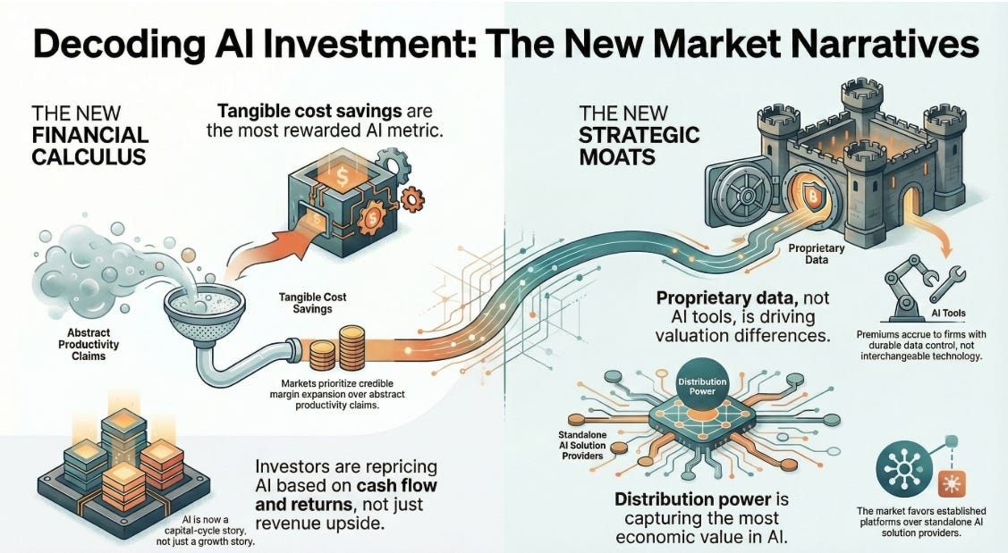 Signal: AI exposure is being repriced through ROIC, cash conversion, and equity duration, not revenue upside.