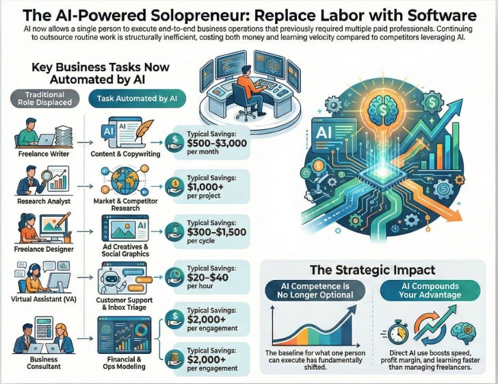 The biggest change this week is that one person can now execute end-to-end business ops that used to require three paid humans. Solopreneurs and micro businesses are still overpaying for writing, research, basic design, scheduling, and first-pass analysis that AI now does instantly. Every week you delay, you lock in higher costs and slower execution than competitors who already replaced labor with software.