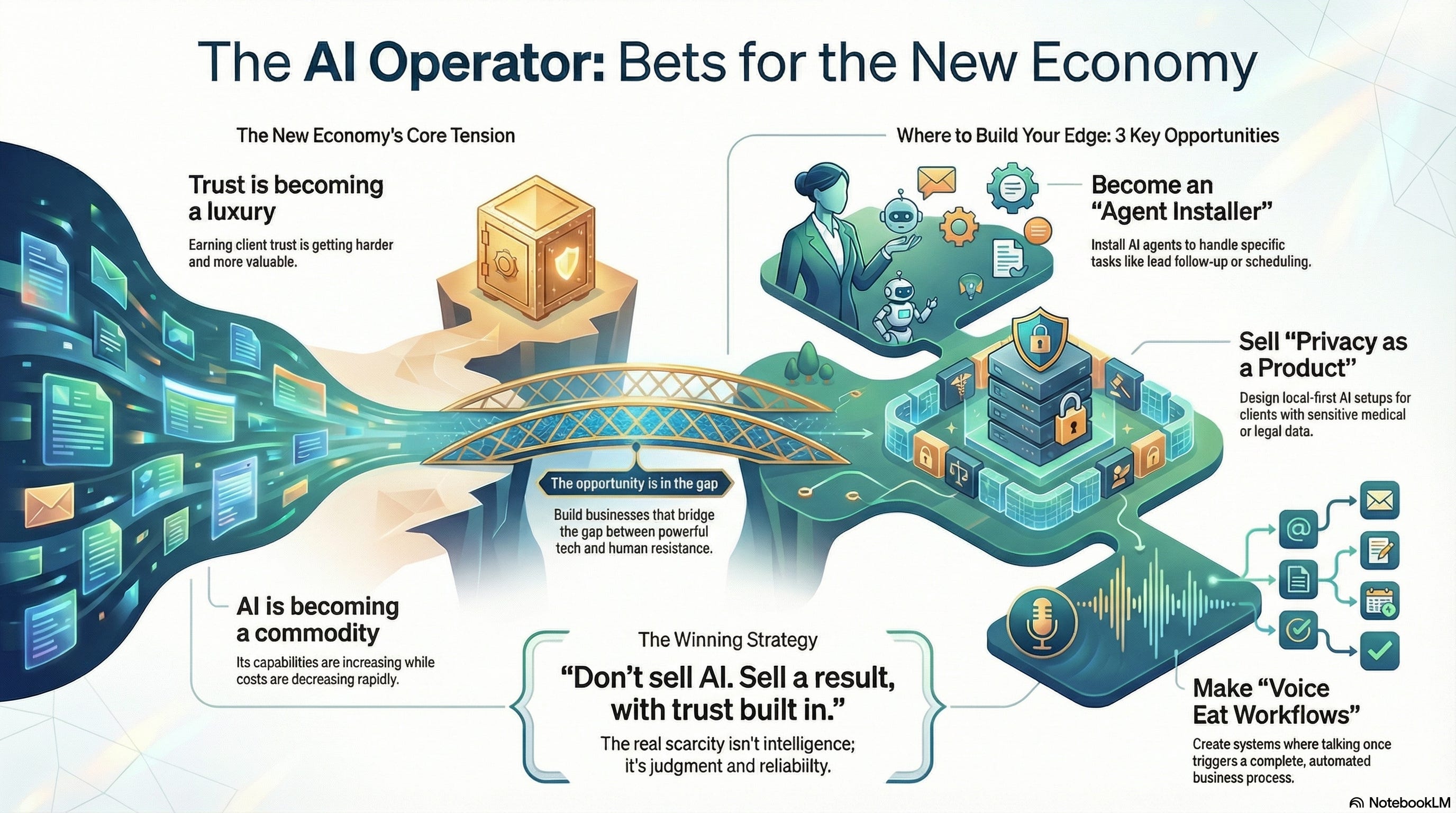The featured article presents seven near-term AI opportunities where founders win by selling outcomes and trust, not tools, hype, or predictions.