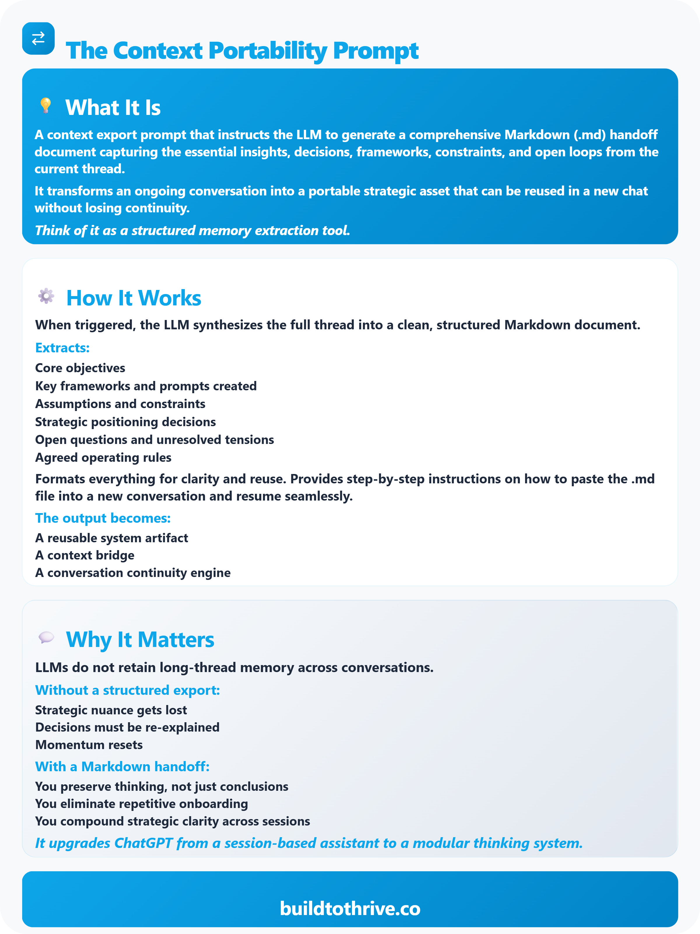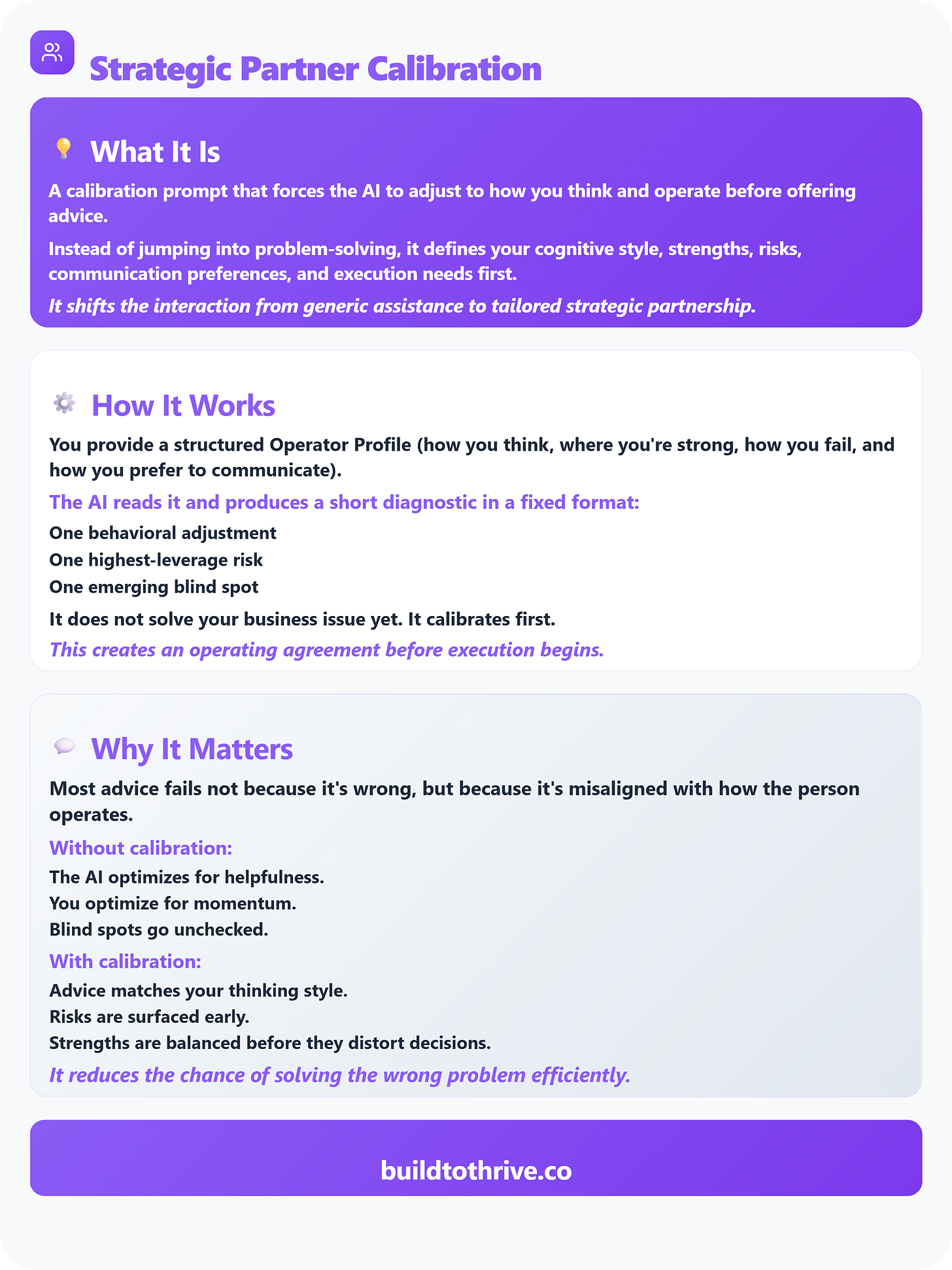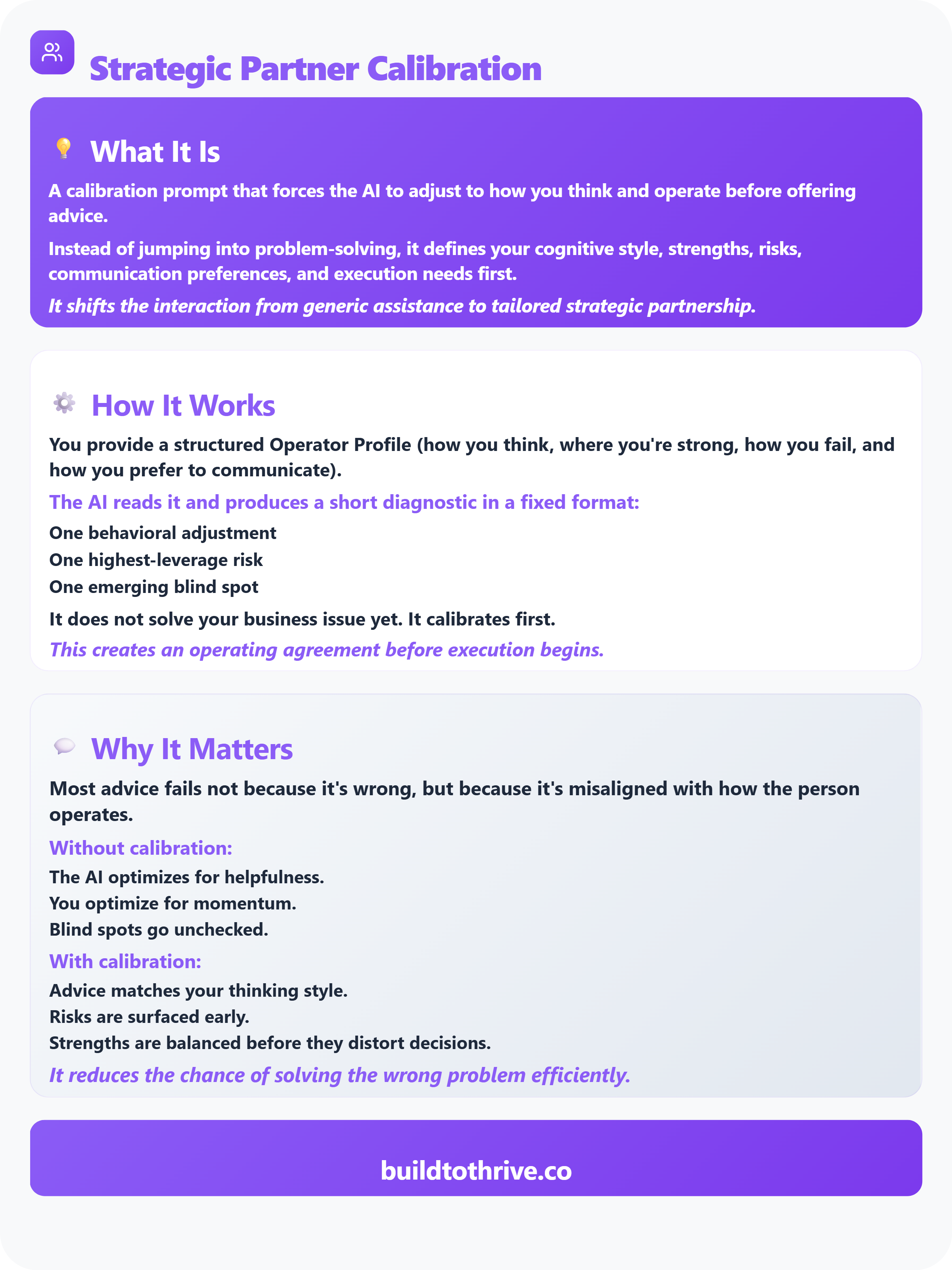 This week, I’m introducing three prompts that act as guardrails for sharper thinking. One forces you to work backwards before building, pressure-testing ideas against real customer pain, measurable outcomes, and business reality before momentum takes over. One calibrates the AI to how you think and operate, protecting against brand drift and misaligned advice before you hit generate. And one turns long conversations into structured strategic assets, preserving context so clarity compounds instead of resetting.
