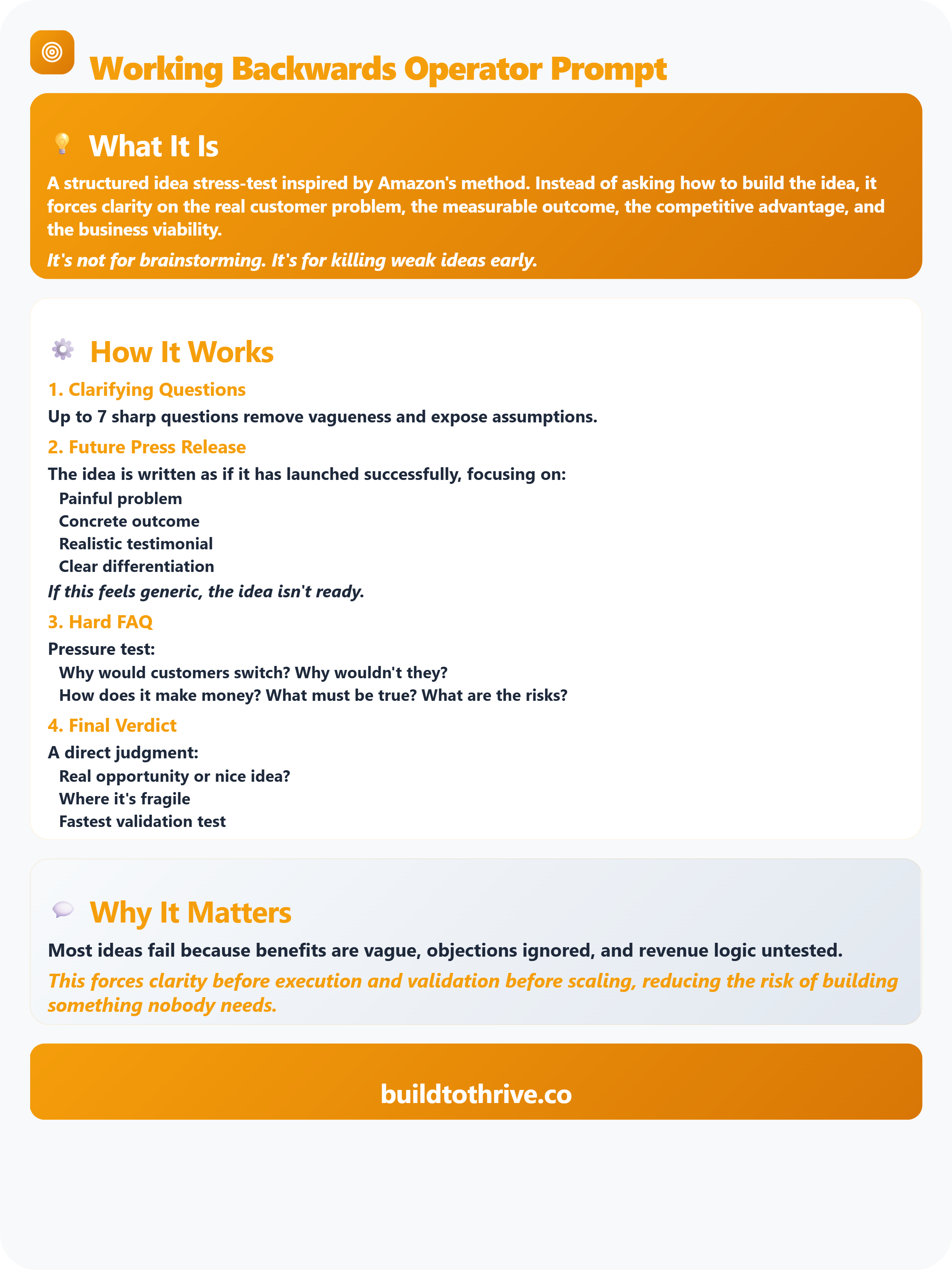 Before building anything, I now run ideas through a simple “Working Backwards” filter inspired by Amazon’s PR/FAQ method. It forces you to define the customer pain, the economic outcome, the risks, and the fastest way to test demand.