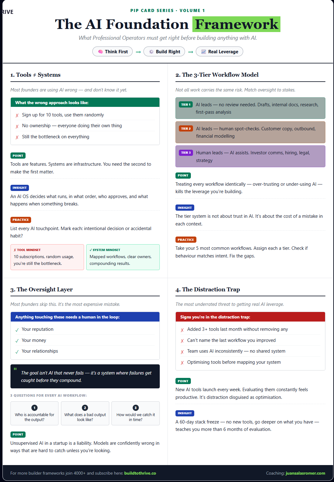 Not tools. Systems. Where AI actually fits in your workflows, how to structure oversight so nothing slips, and how founders stay focused while building real leverage.