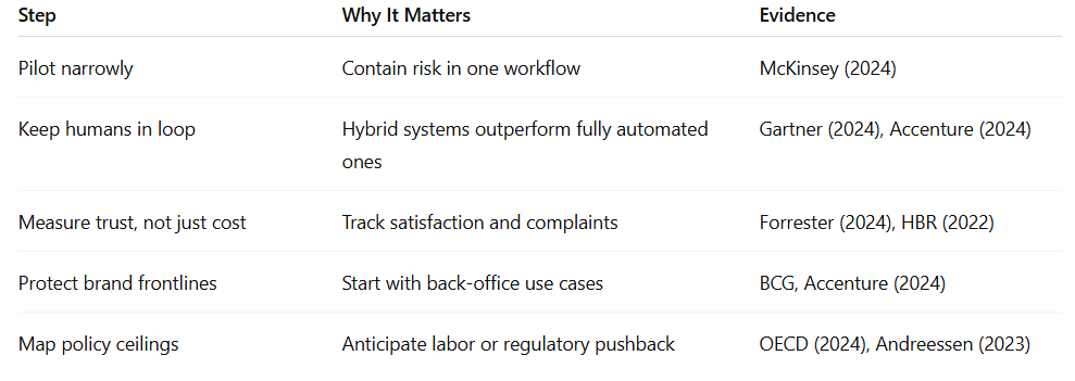 Leaders do not need to choose between rushing in and standing still. A sequenced approach offers a middle path: capturing benefits early in low-risk areas, while building trust, policy readiness, and performance guardrails before scaling.