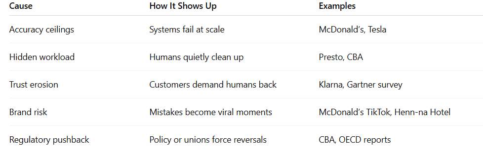 Taken together, these stories point to something bigger than a series of mishaps. They show that when companies rush to automate, they often run into a wall. Trust breaks, hidden workloads surface, or regulators step in. Suddenly, humans are brought back. That is what I call Automation Whiplash: the snap-back effect when tech promises outpace reality.