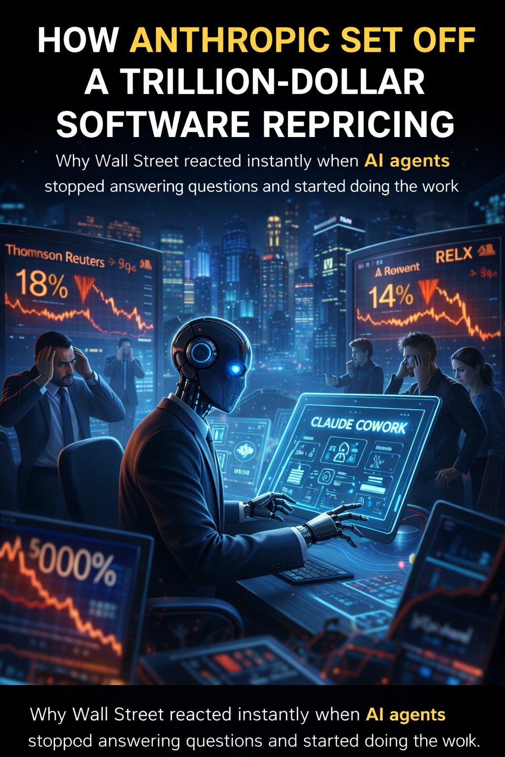 Thomson Reuters, after more than 200 years as the backbone of legal research, fell as much as 18 percent intraday, closing down roughly 16 percent. RELX, the parent of LexisNexis, dropped between 13 and 15 percent. Across software, data, and legal tech, stocks bled hundreds of billions in market value in a single session.