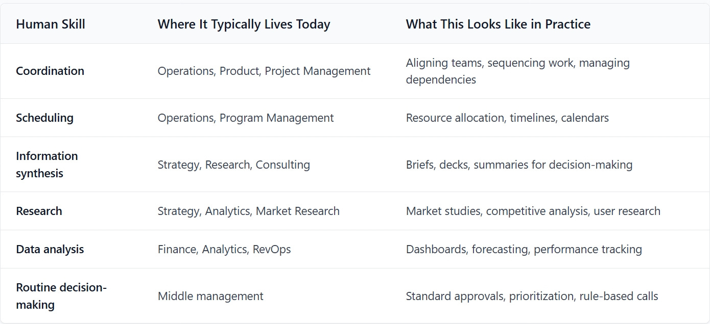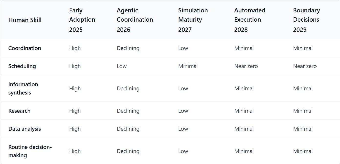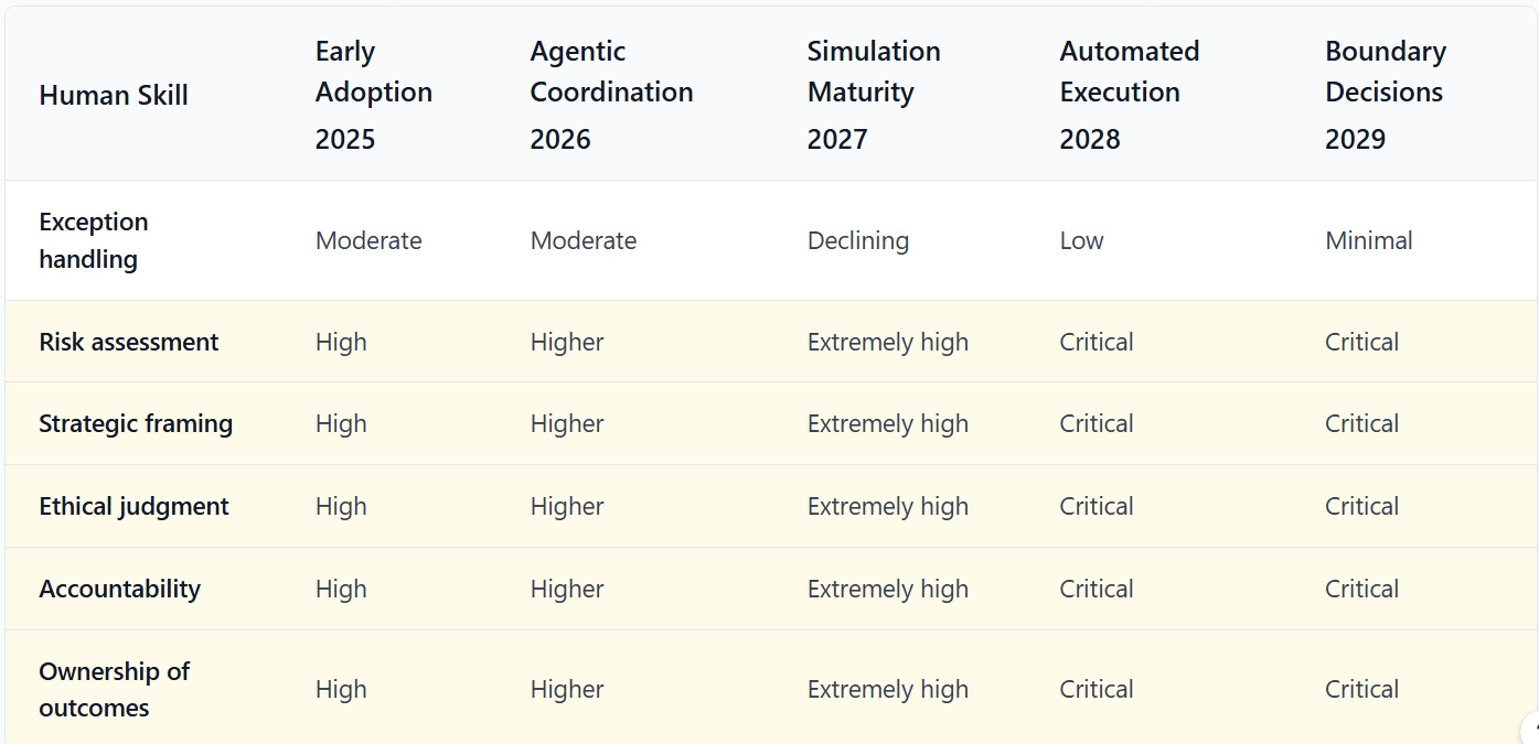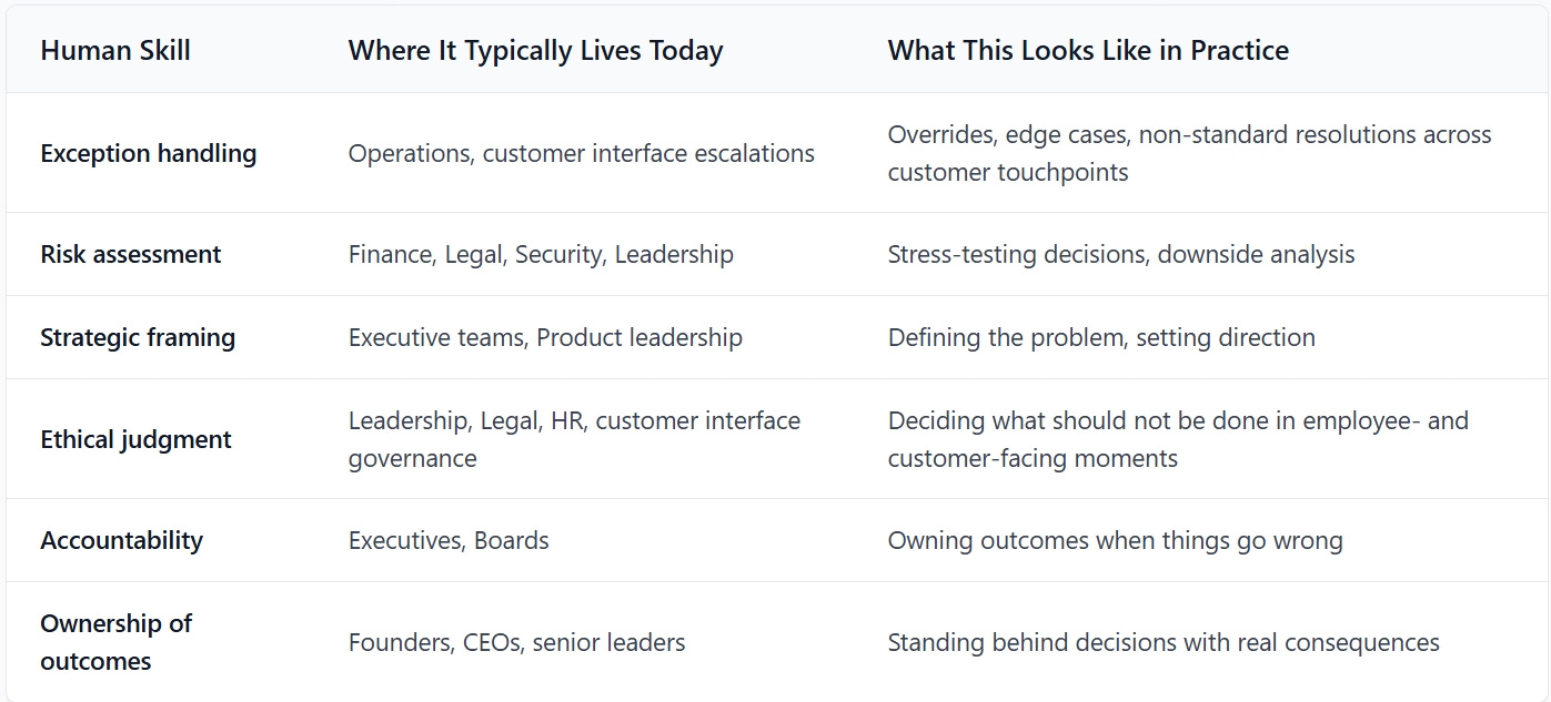This table translates each human skill into where it typically lives inside a company today. It does not predict new job titles. It shows how existing responsibilities change weight as agentic systems mature.