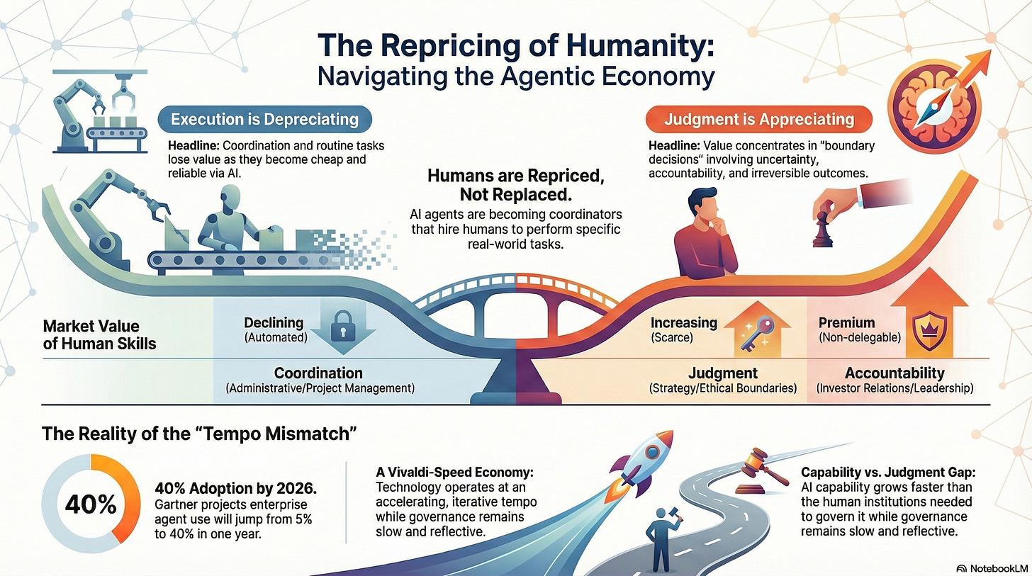 As agents absorb coordination, prediction, and execution, the market value of most tasks within a role declines. What remains valuable are boundary decisions where uncertainty, accountability, and irreversibility concentrate.