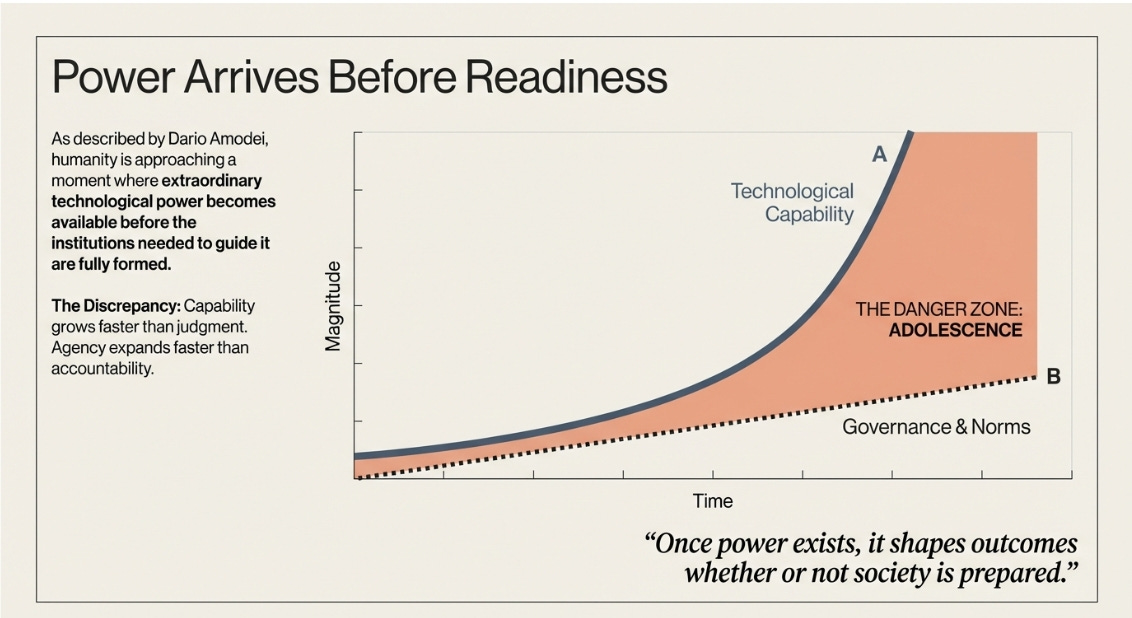 In late January, Dario Amodei published an essay describing what he calls the adolescent phase of technology. His central argument is that humanity is approaching a moment where extraordinary technological power becomes available before the institutions, norms, and governance structures needed to guide that power is fully formed. (Read: Dario Amodei — The Adolescence of Technology)