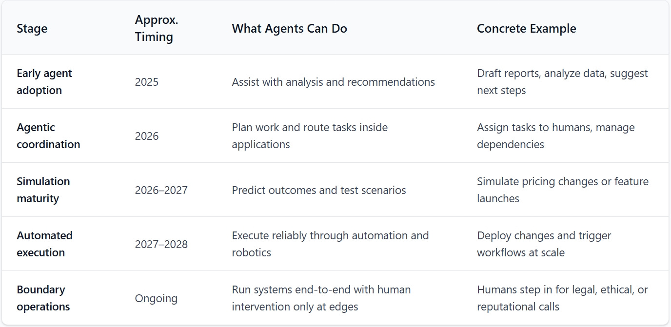 The table below does not describe end states. It outlines capability thresholds that materially change how work is coordinated.